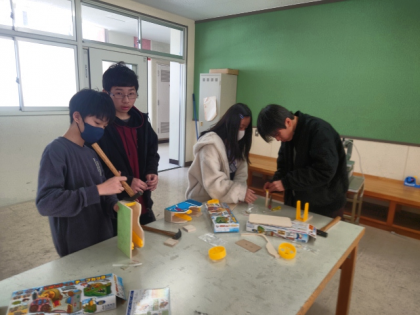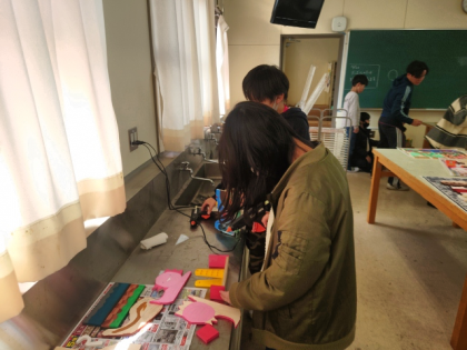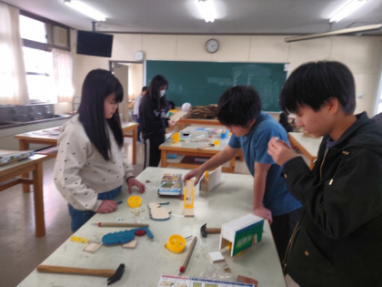 木切れを電動糸のこぎりで切って、絵の具で着色し、テープカッターを作っています。