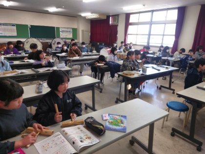 音楽科の時間は、リズムや音の大きさを記号で表したカードを選び、いろいろな楽器で演奏します。