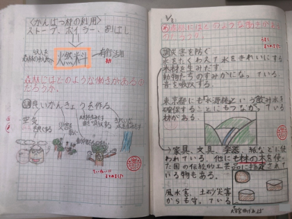 社会科の時間に、「森林の役割」について教科書や資料集をもとにノートにまとめました。