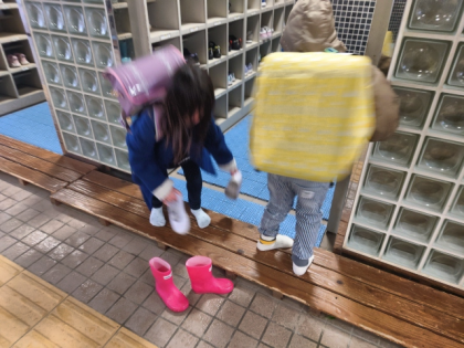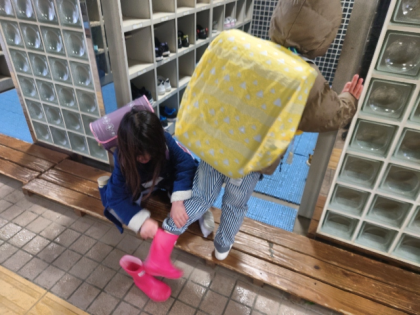 長靴が脱げなくて困っている友達を助けている子がいました。