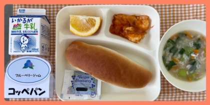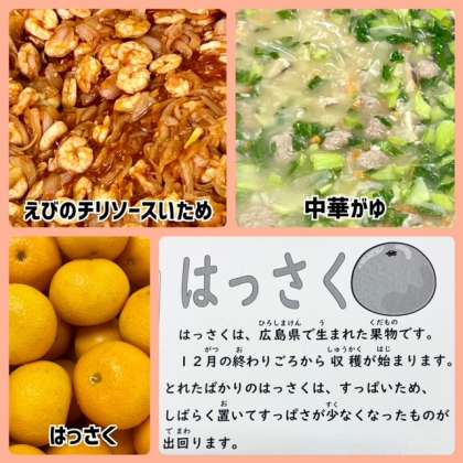 今日の献立は、えびのチリソースいため・中華がゆ・はっさく・コッペパン・ブルーベリージャム・牛乳でした。