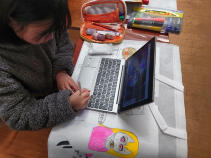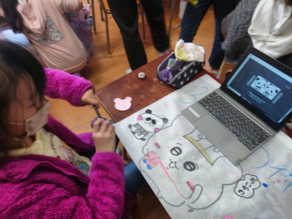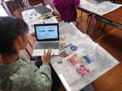 1年間の作品を入れて持って帰る「作品袋」に思い思いの絵を描いています。