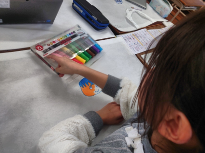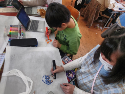 1年間の作品を入れて持って帰る「作品袋」に思い思いの絵を描いています。
