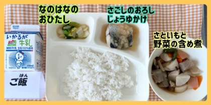 今日の献立は、さごしのおろしじょうゆかけ・さといもと野菜の含め煮・なのはなのおひたし・ごはん・牛乳でした。