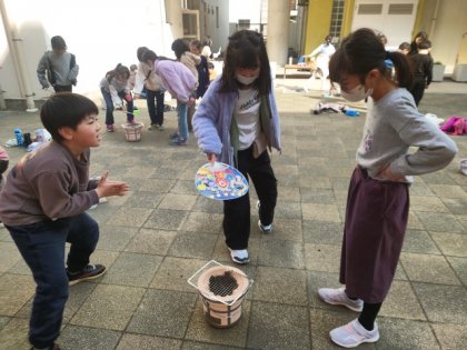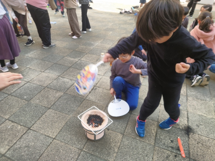 子どもたちは、新聞紙に火をつけ、うちわで一生懸命あおぎ、時間をかけてなんとか炭に火をつけていました。