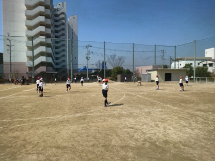 チームでキャッチボールなどの練習をした後、4チームに分かれて、2つのコートで試合をしました。