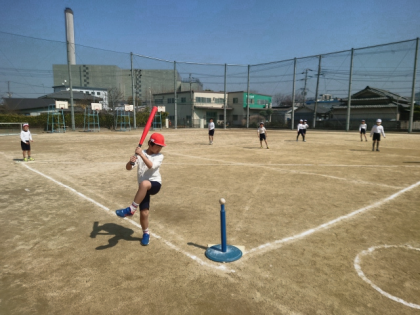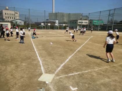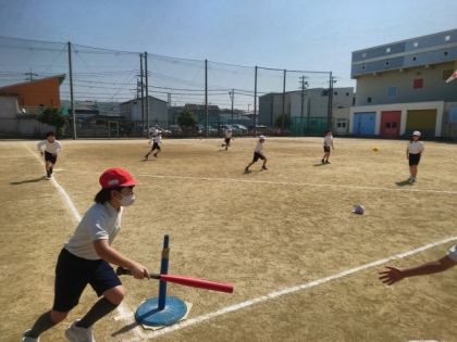 体育科では、「ベースボール型ゲーム」、ティーボールの学習をしました。