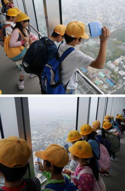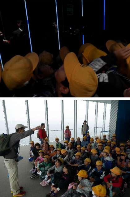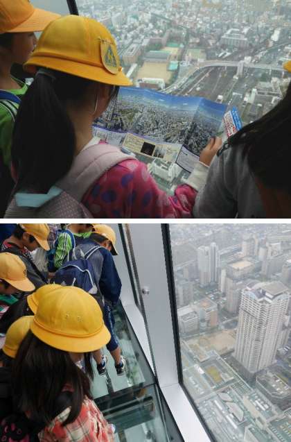 あべのハルカスの16階から60階まで一気にエレベータであがりました。大阪が一望できます。天気が悪くてあまり遠くまで見渡せないのが残念でした。床がガラス張りのところもあり、足のすくむ子どももいました。