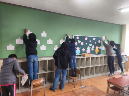 今日は、明日の入学式の準備のために、新2年生と新6年生が登校しました。