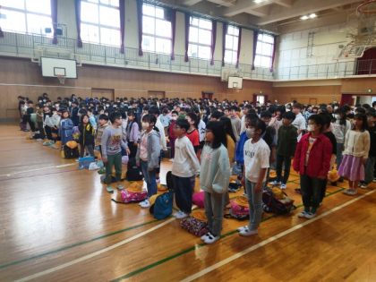 講話の後、校長から子どもたちに教職員の紹介と学級担任の発表をしました。