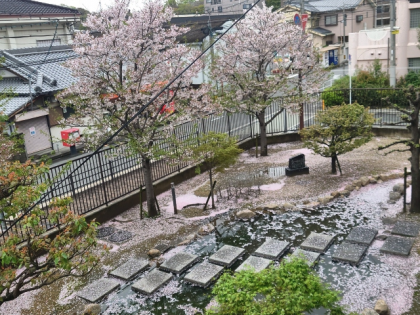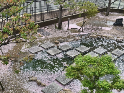 正門そばの池の周りには、花びらがじゅうたんのようで、とてもきれいでした。
