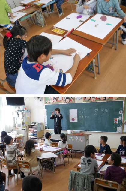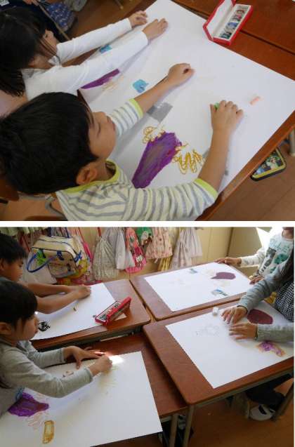 いもほりをした絵を描いています。ほっている自分自身の姿をリアルに描いていきます。掘り出す手、そして、顔、鼻、口、目、まゆげとひとつひとつを意識して描いていきます。