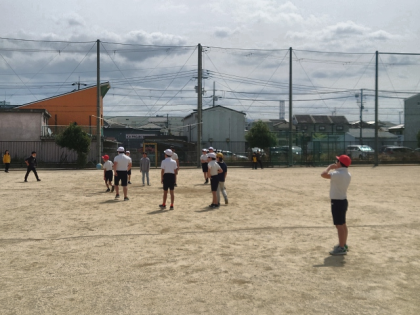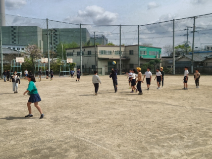 運動場でたくさんの子どもたちが元気に遊んでいます。