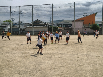 運動場でたくさんの子どもたちが元気に遊んでいます。