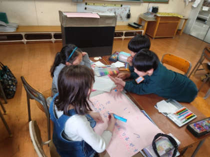 今日はグループで、学校の各教室に掲示する看板を作っています。