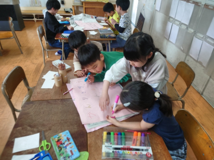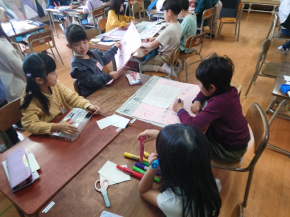 生活科の時間は、1年生に学校のようすを教える「学校たんけん」の準備をしています。