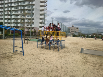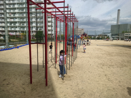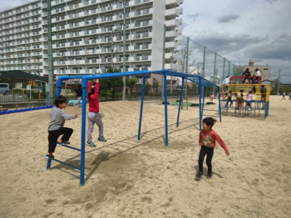 給食前のひととき、校庭の遊具を使うなどして、みんなで楽しく遊びました。