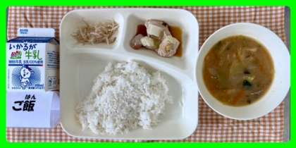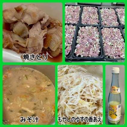 今日の献立は、焼きとり・みそ汁・もやしのゆずの香あえ・ごはん・牛乳でした。