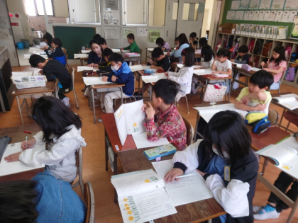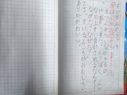 今日は「おもしろかったこと」「すきなところ」「ふしぎだなと思うところ」「みんなで考えてみたいこと」など、初めの感想をノートに書きました。