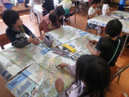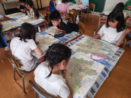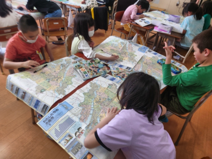社会科の時間は、大阪市の大きな地図を広げながら、大阪市にはどんな場所や施設があるのか、みんなで探しました。
