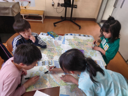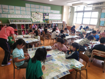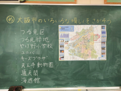 社会科の時間は、大阪市の大きな地図を広げながら、大阪市にはどんな場所や施設があるのか、みんなで探しました。