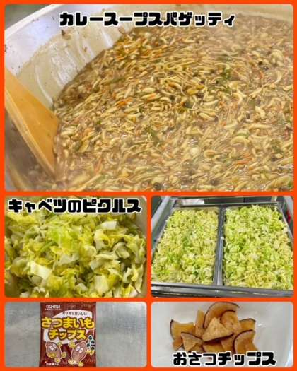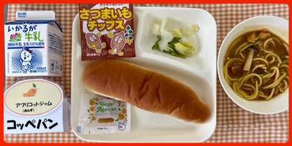 今日の献立は、カレースープスパゲッティ・キャベツのピクルス・おさつチップス・コッペパン・アプリコットジャム・牛乳でした。