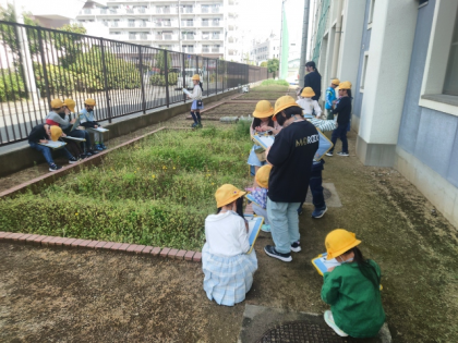 理科の時間に、教室を出て、虫めがねを持って、学習園で生き物や植物など、春の自然を観察してワークシートにまとめました。