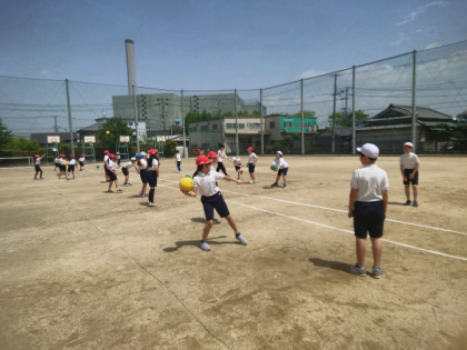 体育科の時間は、ペアでボールを投げたり受けたりする運動をしました。