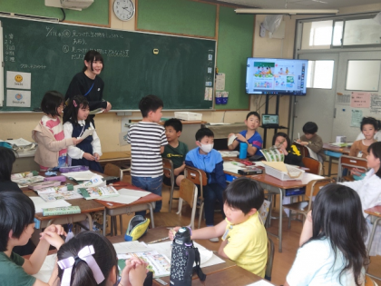 理科の時間は、学習園で見つけた春の生き物をグループで紹介し合いました。