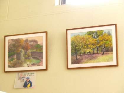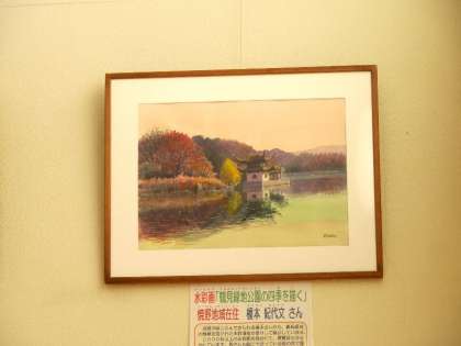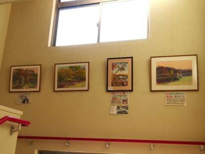 1階から2階の階段踊り場に地域の方の絵を展示しています。絵が変わりましたよ。いろんな鶴見緑地の場所を鑑賞してください。