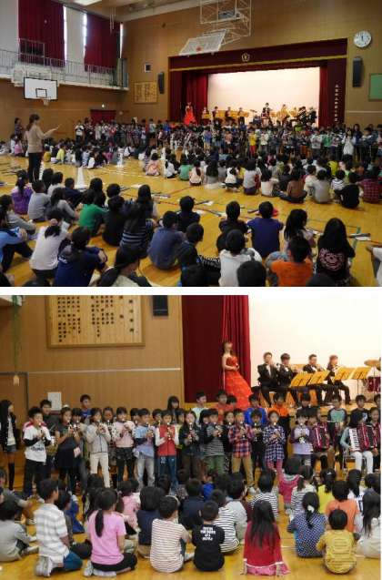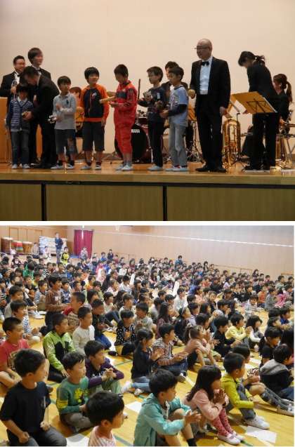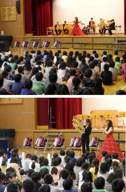 全校児童による音楽鑑賞会では、後半では「リズムに挑戦」ということで、舞台にあがって一緒に演奏しました。みんなも手拍子でリズムをとりながら「テキーラ」と声をあげて盛り上がりました。そして皆のよく知っているジブメドレーで一緒に口ずさみました。最後は3年生と6年生が一緒にリコーダやアコーディオンで合奏しました。