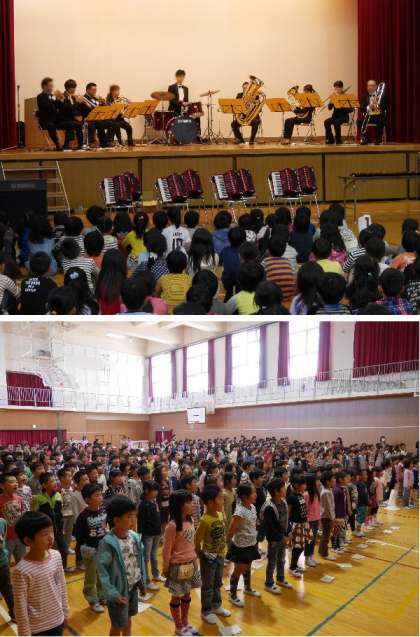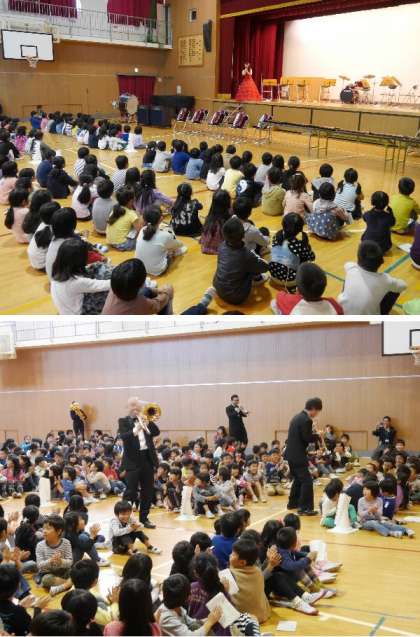 今日は楽団のかたに来ていただき、体育館で全校児童による音楽鑑賞会をおこないました。ドレスをきた司会の女性の進行で、管楽器を演奏しながら楽団の方の入場です。大きな迫力ある音に子どもたちもびっくりしていました。「剣の舞」の演奏のあと、焼野小学校の校歌を伴奏いただき全員で歌いました。