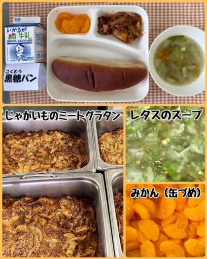 今日の献立は、じゃがいものミートグラタン・レタスのスープ・みかん(缶)・黒糖パン・牛乳でした。