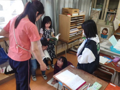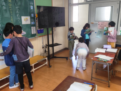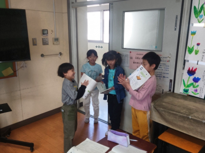 グループに分かれて、ナレーター役やかえる役など役割を分担しながら、楽しく音読しました。