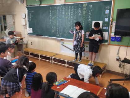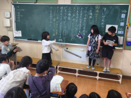 グループに分かれて、ナレーター役やかえる役など役割を分担しながら、楽しく音読しました。
