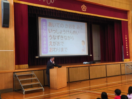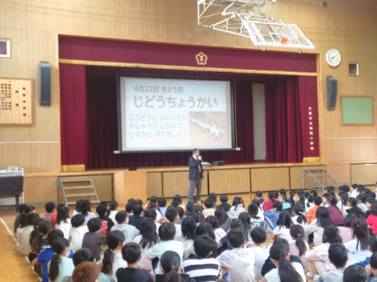 新学期1回目の児童朝会は、2年生から6年生の子どもたちが講堂に集まって行いました。
