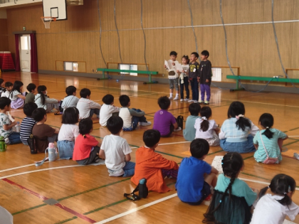 1・2年生でグループをつくり、2年生が1年生をリードして学校をまわります。