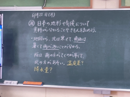 社会科の時間は、日本の気候や地形について、資料からわかることや疑問など、ノートに書き出しました。