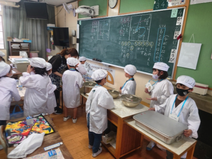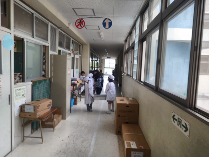 先週までは、6年生のおにいさん、おねえさんが1年生の教室に給食を運んでくれましたが、今日からは自分たちで給食室まで取りに行きます。