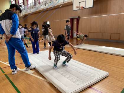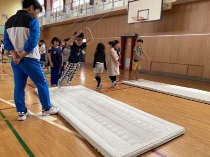 20分休みには、5月の体力テストに向けて、ソフトボール投げや立ち幅とび、反復横とびなどの練習ができるよう、体育館に用具や器具を設置しました。
