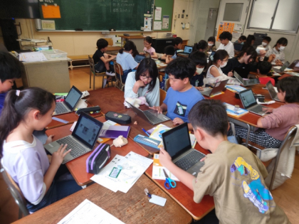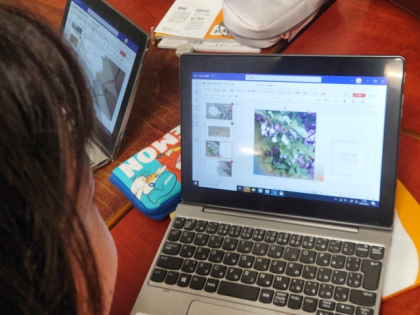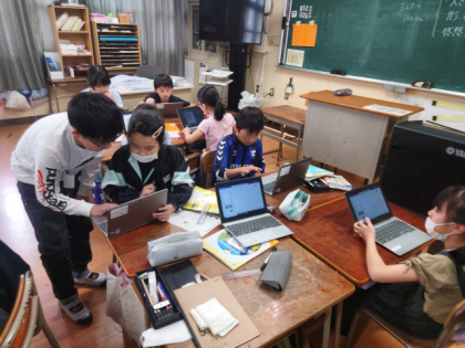 理科の時間は、自分たちで見つけた春の自然を紹介するためのプレゼンを学習用端末でつくっています。