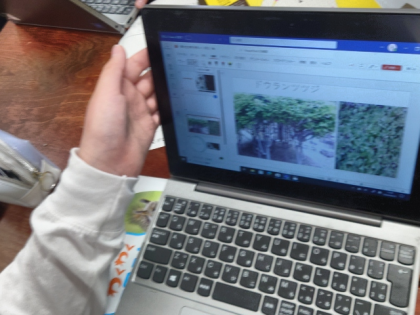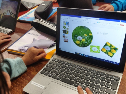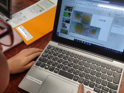 理科の時間は、自分たちで見つけた春の自然を紹介するためのプレゼンを学習用端末でつくっています。