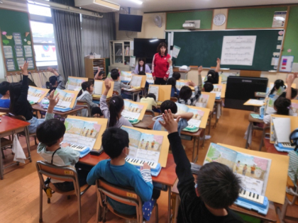 音楽科の時間は、「朝のリズム」の歌を歌いながら、リズムに合わせて手拍子や足ぶみをしました。