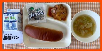 今日の献立は、煮こみハンバーグ・野菜スープ・ミニフィッシュ・黒糖パン・牛乳でした。