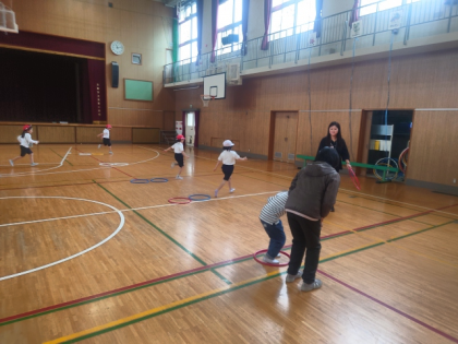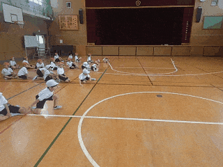床に寝ころんだ状態などいろいろなポーズから、ホイッスルの合図でゴールに向かってダッシュします。