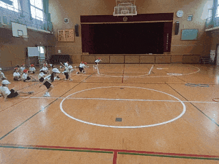 床に寝ころんだ状態などいろいろなポーズから、ホイッスルの合図でゴールに向かってダッシュします。