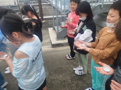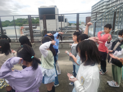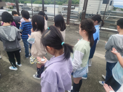 社会科の時間は、方位磁針の使い方を教わったあと、屋上に上がって学校のまわりのようすを見ました。