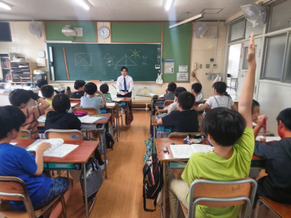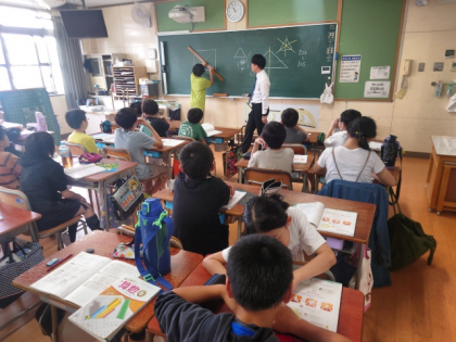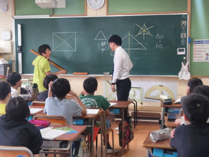 算数科の時間は、三角形や四角形などについて、線対称や点対称かどうかを調べ、対象の軸や対象の中心をみつけました。