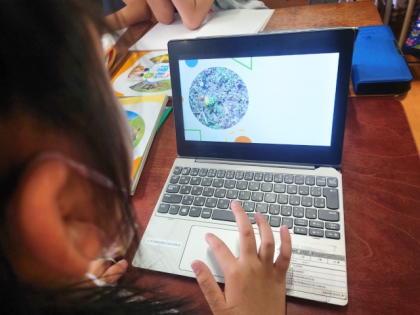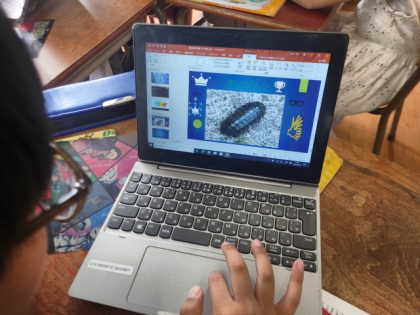 理科の時間は、自分たちで見つけた春の自然を紹介するためのプレゼンを学習用端末でつくっています。