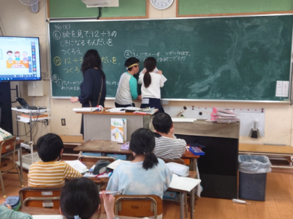 算数科の時間は、教科書の絵を見て、式が「12÷3」になる問題を考えました。